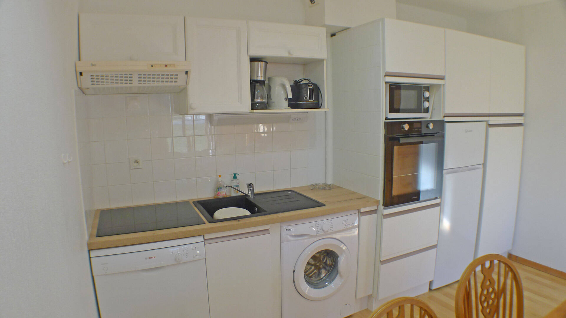 - Separate kitchen (4.10m2, 1 velux): oven, dishwasher, hob, refrigerator/freezer (190L), washing machine
