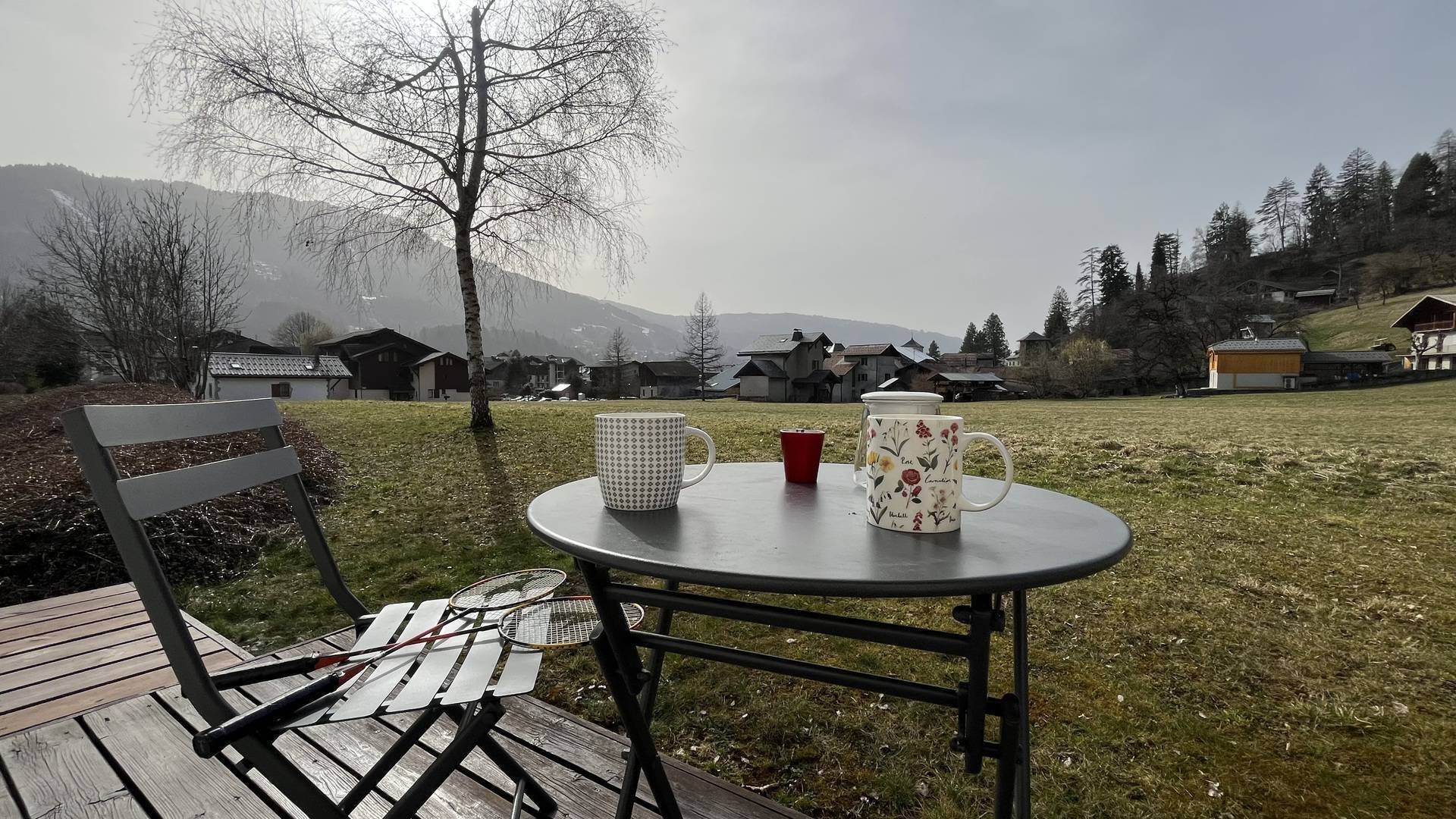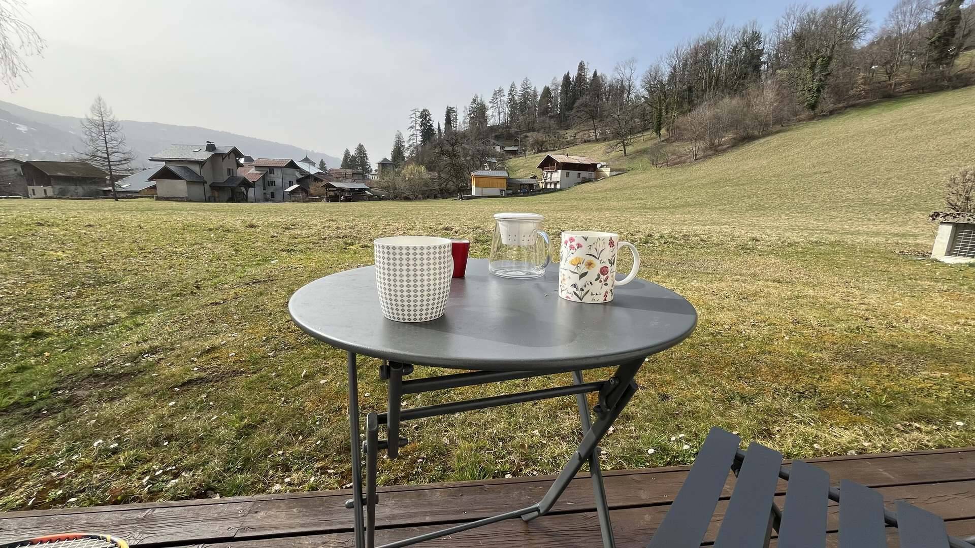 - A terrace with furniture, facing East overlooking the plain and mountain