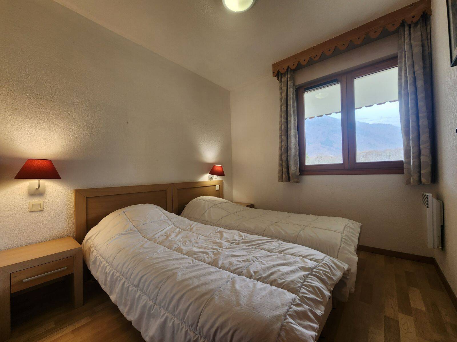 - Chambre 2 (9,00m2,1 fenêtre,ouest,montagnes-habitations) :1 lit double avec TV et placard