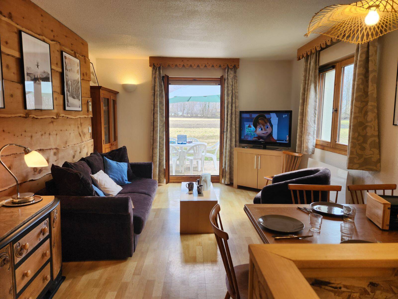 - Séjour (21.55 m2,1baie vitrée+2 fenêtres, Ouest, vue: montagnes-habitations-route) : TV écran LCD plat/DVD,Clic-clac